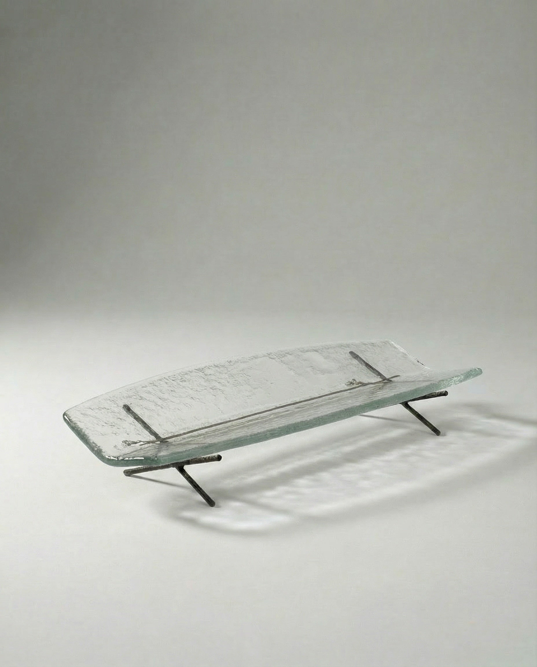 The name Hakou is not easily translated into a single word but evokes a delicate, fleeting image—a serene atmosphere inspired by “the reflection of light on water.” The collection features a sheet of glass, crafted with precision to a thickness of just one centimeter. Its shape, reminiscent of a leaf or a boat gently tilted by the wind, appears to float effortlessly above a refined metal base.