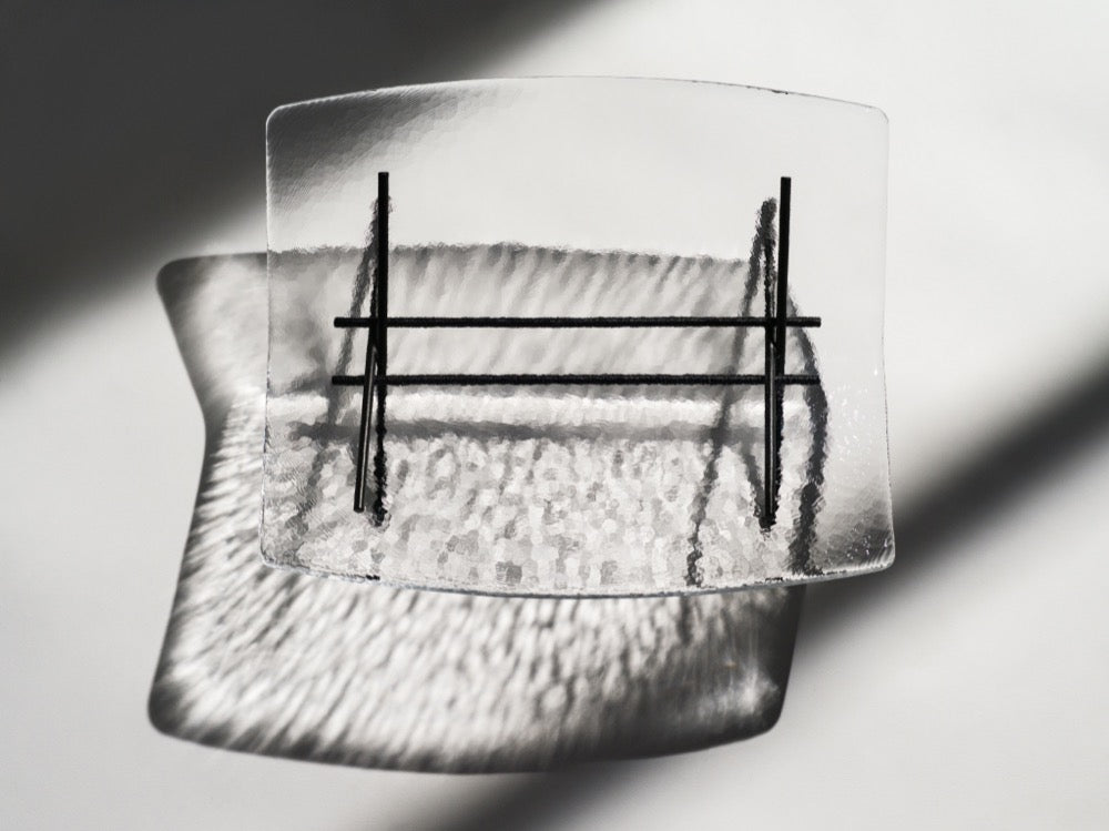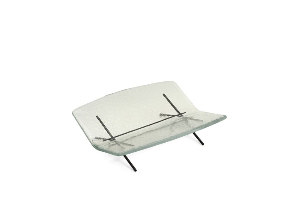 The name Hakou is not easily translated into a single word but evokes a delicate, fleeting image—a serene atmosphere inspired by “the reflection of light on water.” The collection features a sheet of glass, crafted with precision to a thickness of just one centimeter. Its shape, reminiscent of a leaf or a boat gently tilted by the wind, appears to float effortlessly above a refined metal base.
