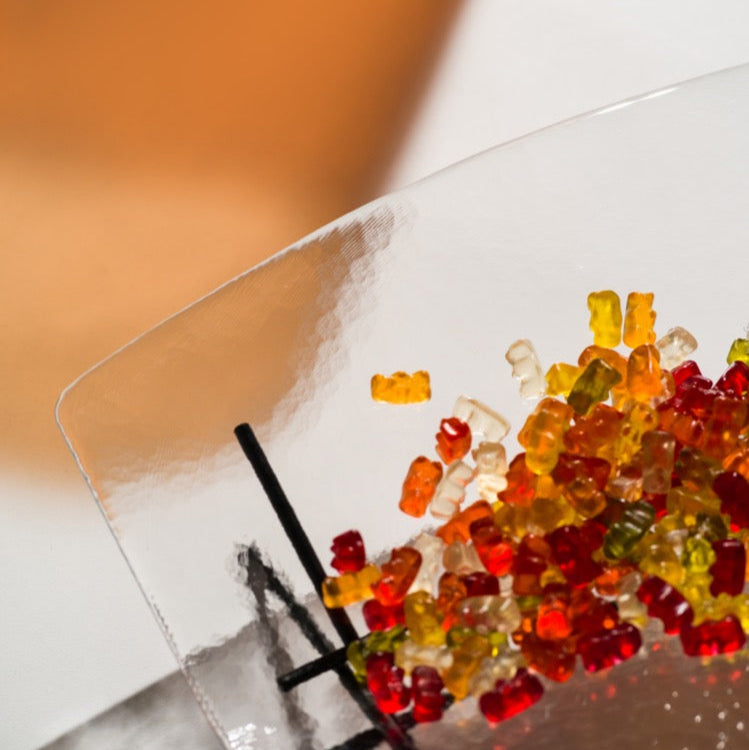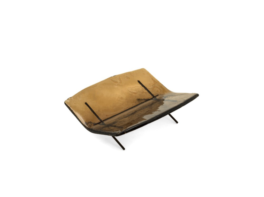 The base, composed of a series of intersecting metal rods, forms a slender trestle, creating an elegant contrast to the delicate transparency of the glass. As sunlight passes through, it illuminates the piece with a graceful, ethereal glow, capturing the transient beauty of nature in a moment of stillness.