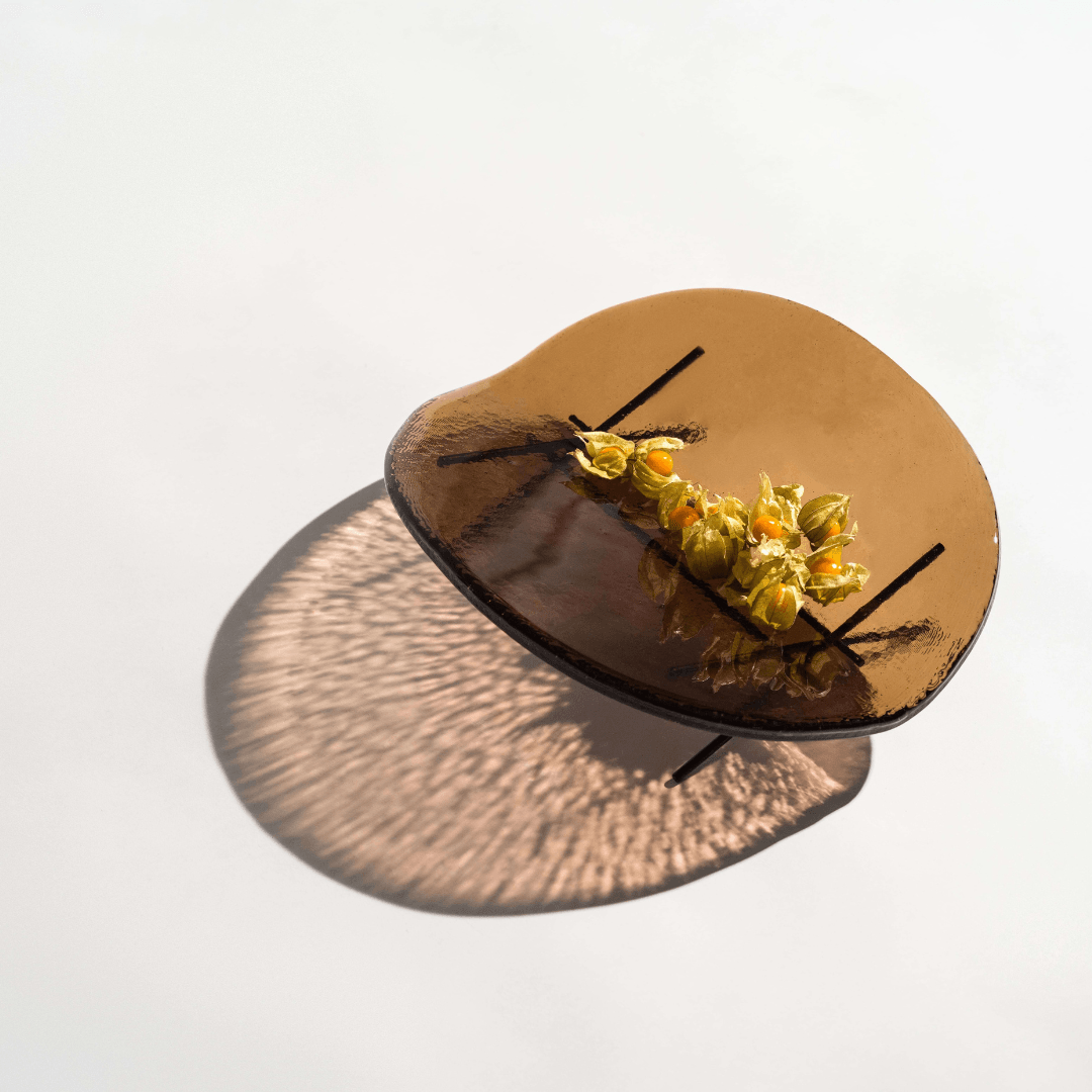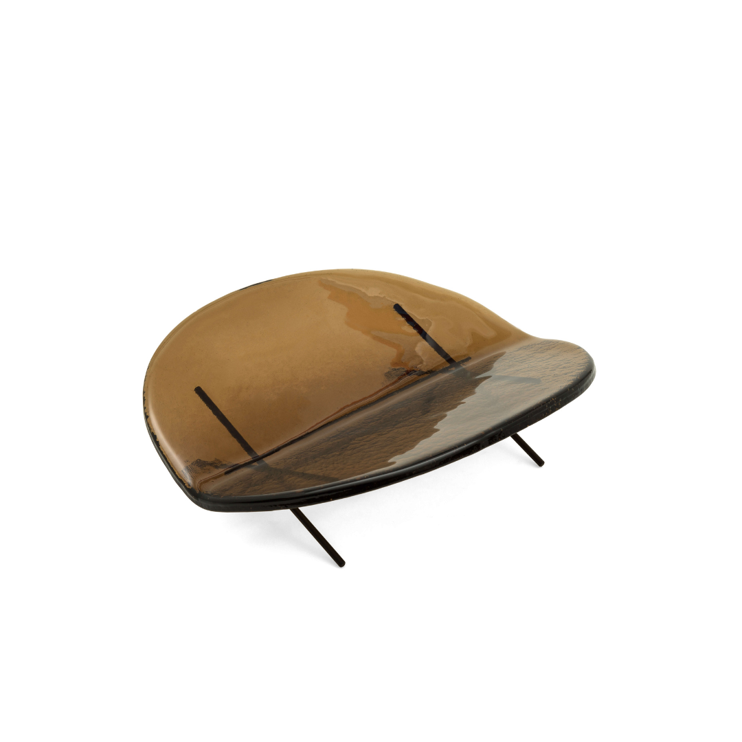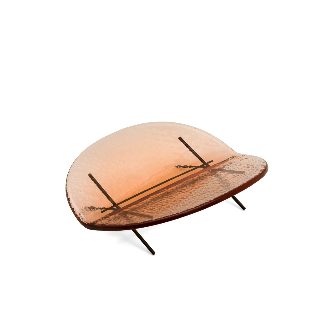 The name Hakou is not easily translated into a single word but evokes a delicate, fleeting image—a serene atmosphere inspired by “the reflection of light on water.” The collection features a sheet of glass, crafted with precision to a thickness of just one centimeter. Its shape, reminiscent of a leaf or a boat gently tilted by the wind, appears to float effortlessly above a refined metal base.