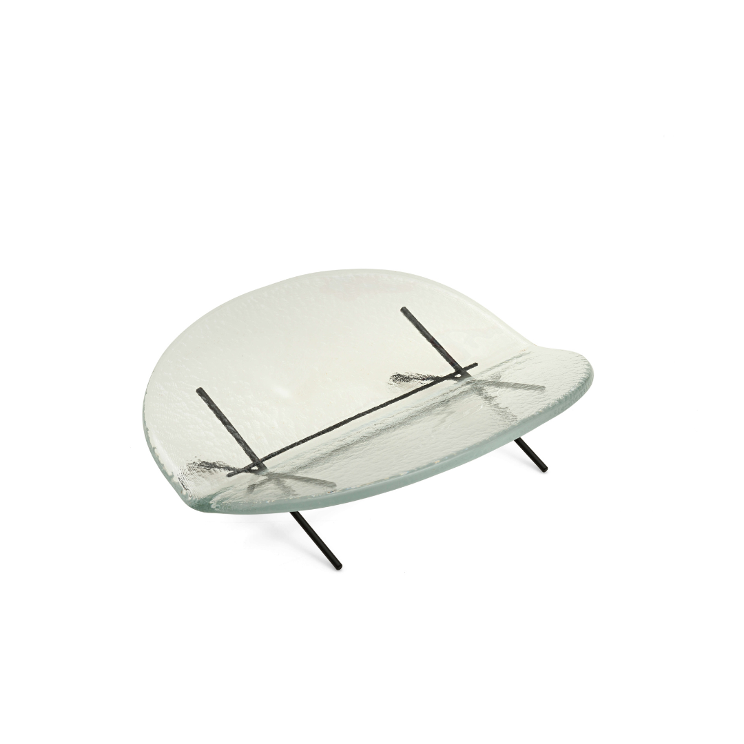The base, composed of a series of intersecting metal rods, forms a slender trestle, creating an elegant contrast to the delicate transparency of the glass. As sunlight passes through, it illuminates the piece with a graceful, ethereal glow, capturing the transient beauty of nature in a moment of stillness.
