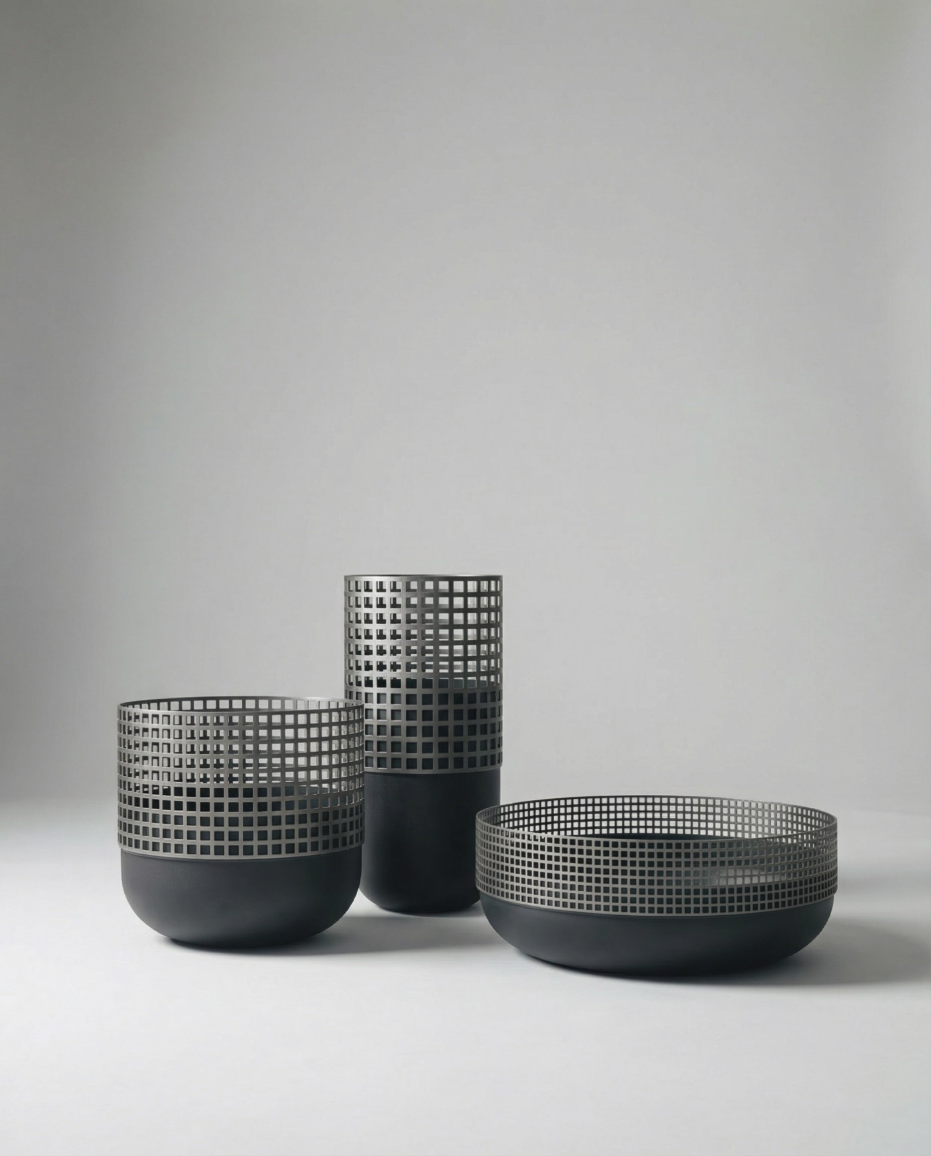 The Mia collection stands out for its perfect balance between aesthetics and functionality. Comprising three uniquely shaped pieces, this line of vases showcases a bold character through the contrast of materials and textures. The soft, curved lines of the metal base meet the architectural lightness of the perforated sheet metal upper section, creating a refined and contemporary visual effect. Ideal for enhancing any space, the Mia vases embody sophisticated and timeless design